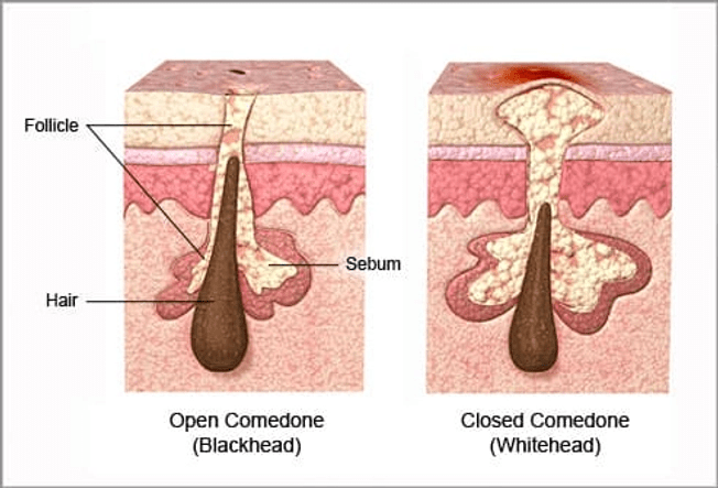 Comedones are clogged hair follicles. They can be open (blackheads) or closed (whiteheads). Comedones are the earliest form of acne lesions. They develop due to excess oil and dead skin cells blocking the pores. Keeping your skin clean and using non-comedogenic skincare products can help manage comedones. Products with salicylic acid are very effective.